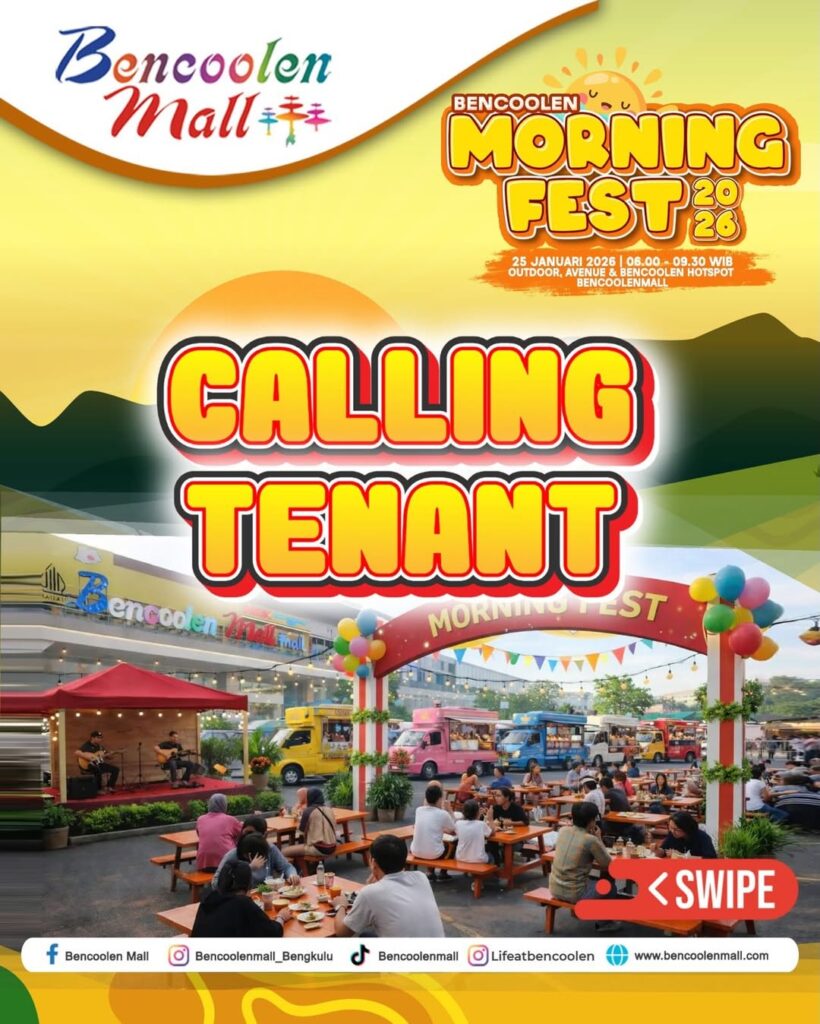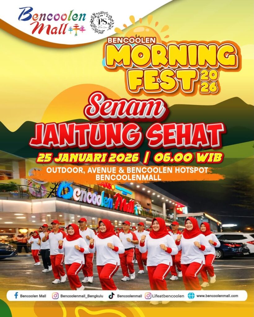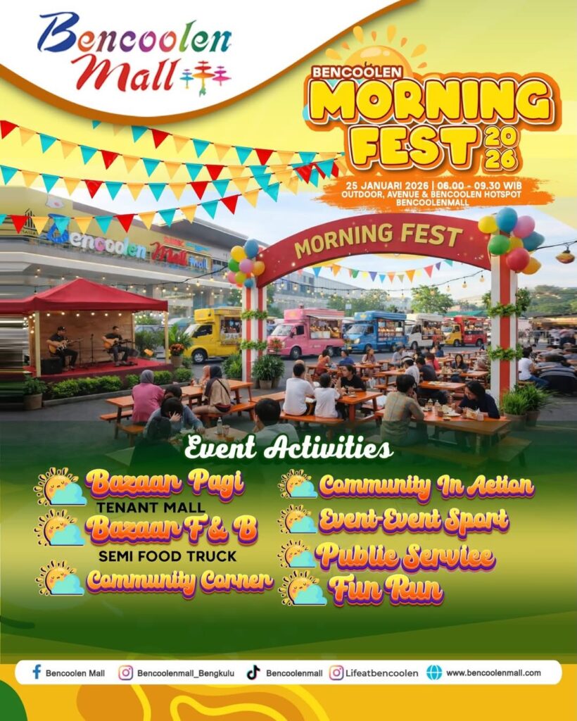 Bencoolen Morning Fest dirancang sebagai ruang berkumpul yang menghadirkan pengalaman kuliner, hiburan, dan aktivitas komunitas dalam satu event pagi yang penuh semangat dan kebersamaan. Kegiatan ini akan diselenggarakan pada 25 Januari 2026, pukul 06.00 – 09.30 WIB, bertempat di Outdoor Area, Avenue & Bencoolen Hotspot Bencoolen Mall Bengkulu. Beragam aktivitas menarik siap dinikmati pengunjung, mulai dari Bazaar Pagi tenant mall, Bazaar F&B semi food truck, Community Corner, Community in Action, event-event olahraga, public service, hingga Fun Run yang mendukung gaya hidup sehat.
