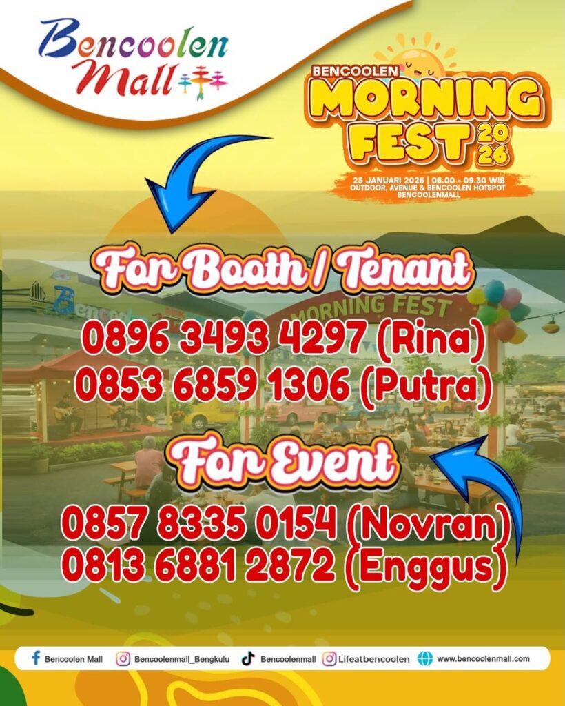 Dengan konsep outdoor yang nyaman, dekorasi ceria, serta hiburan yang menyenangkan, Bencoolen Morning Fest 2026 menjadi pilihan ideal untuk menghabiskan waktu pagi bersama keluarga, sahabat, maupun komunitas. Event ini tidak hanya menghadirkan hiburan, tetapi juga memperkuat interaksi sosial dan semangat hidup aktif di tengah masyarakat Bengkulu.