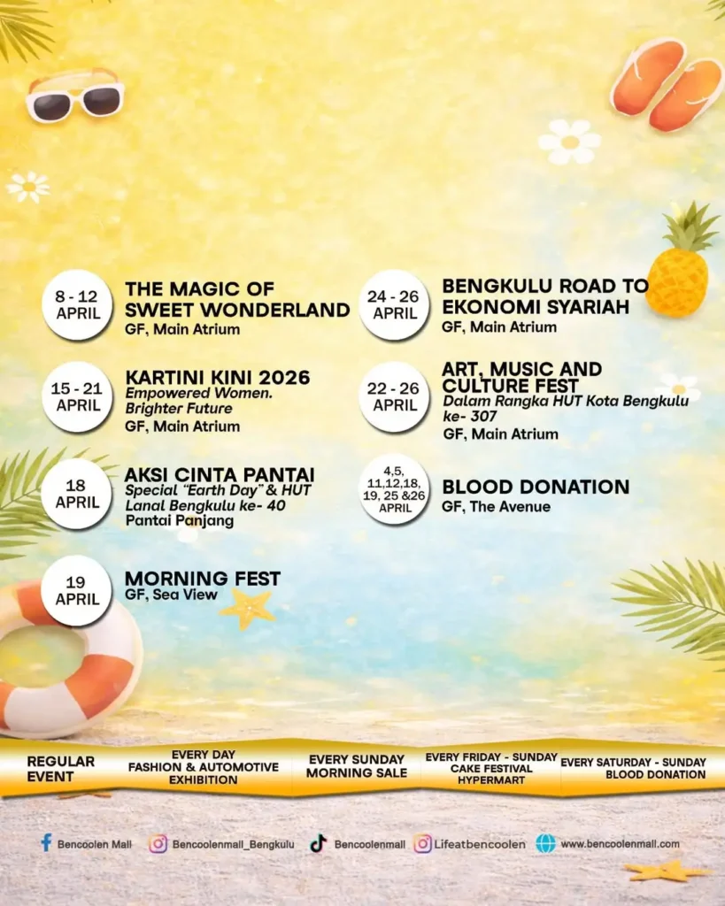 Mengusung tema Summer Glow, rangkaian acara dimulai dari The Magic of Sweet Wonderland, dilanjutkan dengan perayaan inspiratif Kartini Kini 2026, hingga festival budaya dan musik dalam rangka HUT Kota Bengkulu ke-307. Tidak hanya itu, pengunjung juga bisa ikut berpartisipasi dalam kegiatan sosial seperti Blood Donation dan aksi peduli lingkungan di Pantai Panjang.