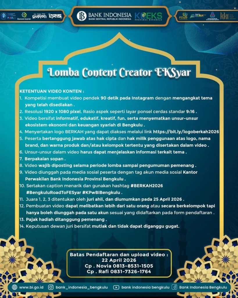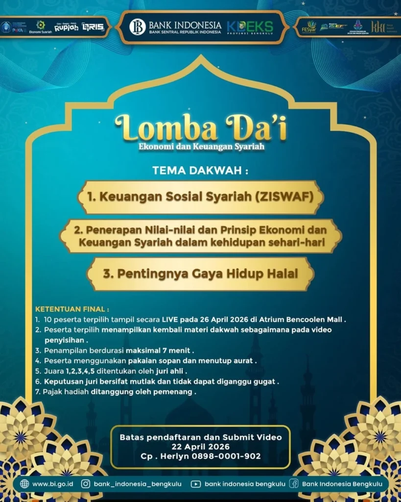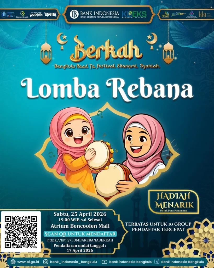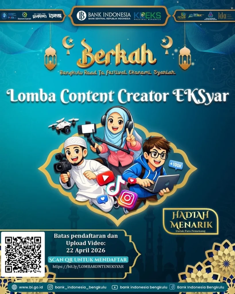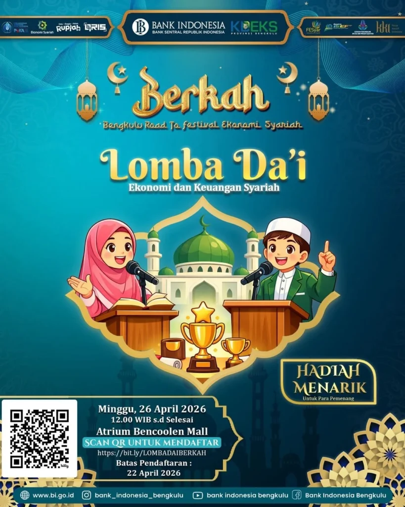 Jangan lewatkan kesempatan untuk menjadi bagian dari perubahan menuju ekonomi yang lebih berkah, inklusif, dan berkelanjutan. Ajak keluarga dan temanmu, dan rasakan langsung pengalaman seru di Festival Ekonomi Syariah Bengkulu 2026!