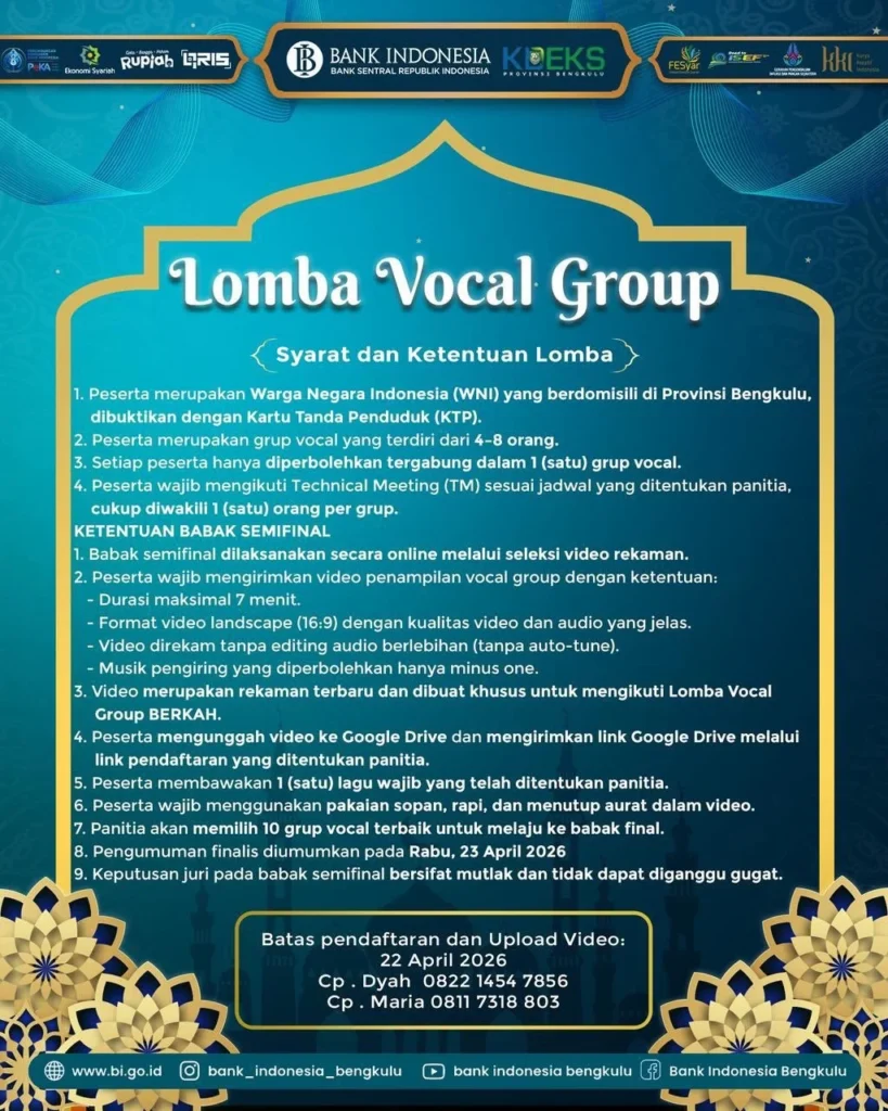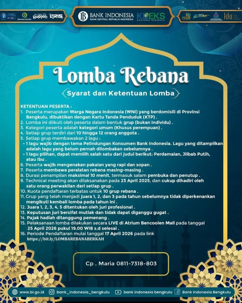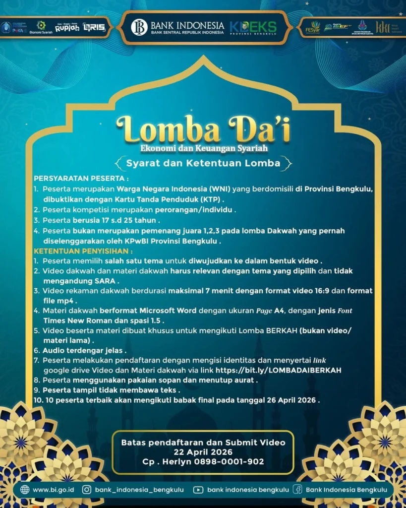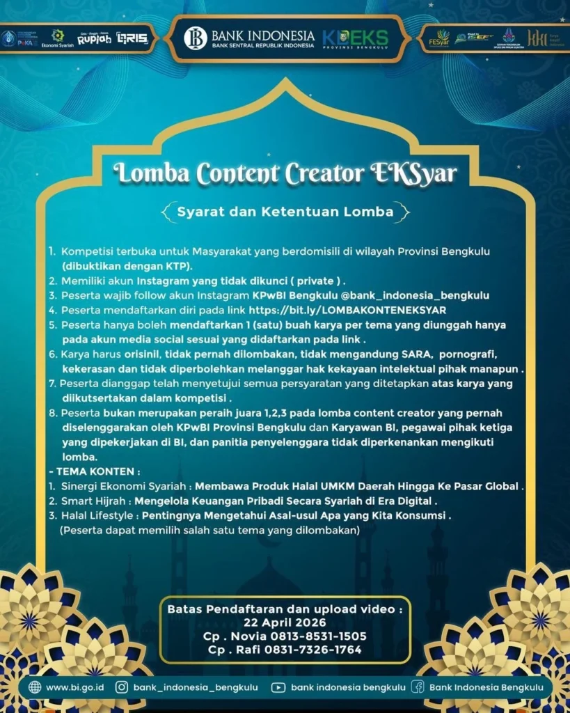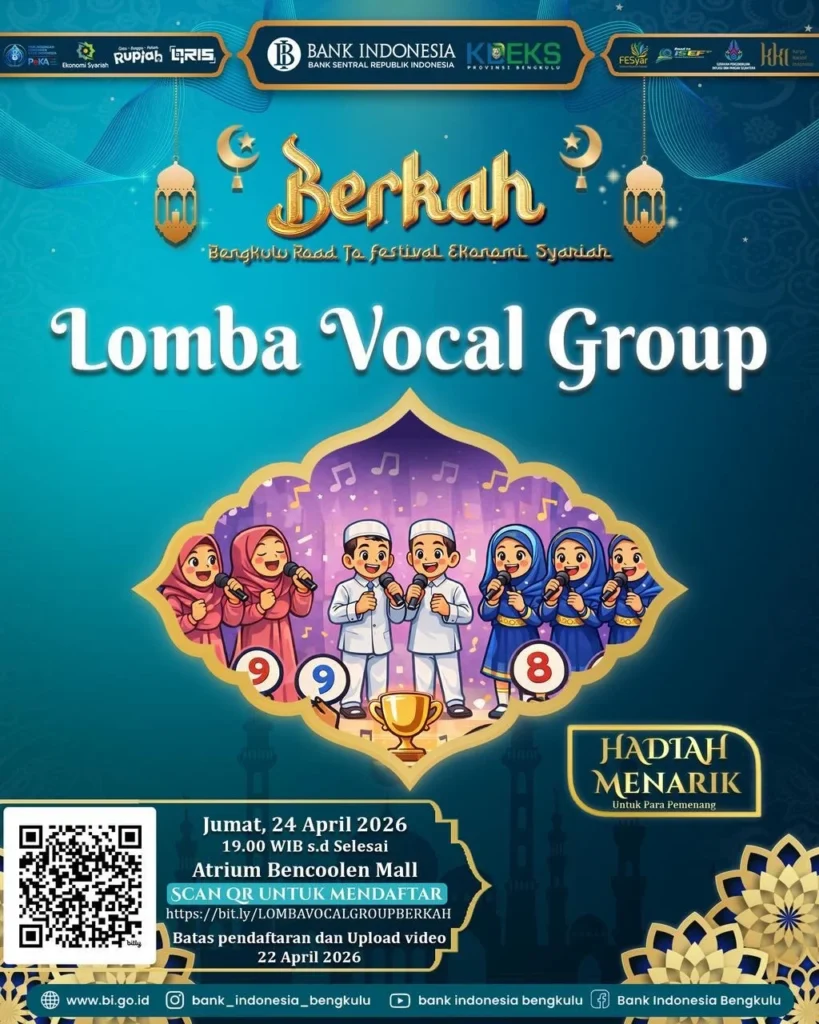 Jangan lewatkan kesempatan untuk menjadi bagian dari perubahan menuju ekonomi yang lebih berkah, inklusif, dan berkelanjutan. Ajak keluarga dan temanmu, dan rasakan langsung pengalaman seru di Festival Ekonomi Syariah Bengkulu 2026!