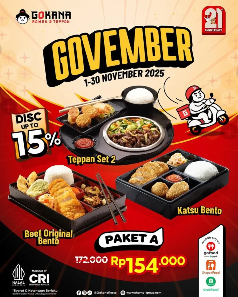 Siapa bilang makan enak harus mahal? Gokana Bencoolen Mall hadir dengan promo Govember hemat yang bikin dompet tetap aman tanpa mengurangi kenikmatan makanmu. Di bulan penuh kejutan ini, Gokana Bencoolen Mall memberikan diskon hingga 15% untuk setiap menu favoritmu!