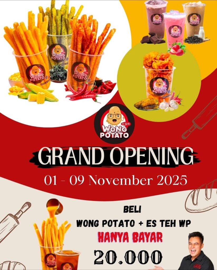 Momen Grand Opening Wong Potato ini juga semakin spesial karena ada berbagai promo menarik yang hanya berlaku dalam waktu terbatas. Jadi, jangan sampai ketinggalan kesempatan untuk menikmati cemilan renyah, lezat, dan harga yang bersahabat.