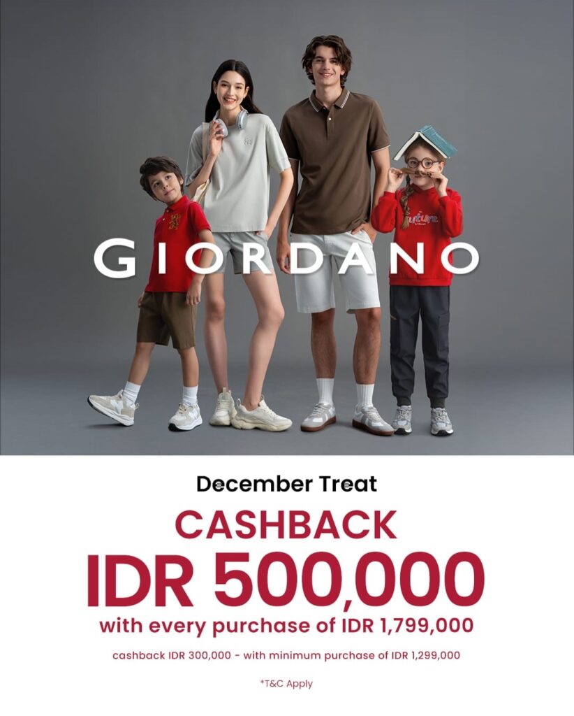 Giordano hadir membawa kabar terbaik buat kamu! Di bulan Desember ini, Giordano menawarkan December Treat dengan cashback besar-besaran hanya dengan minimum purchase di Bencoolen Mall. Kini kamu bisa tampil lebih keren, nyaman, dan stylish tanpa harus mengeluarkan biaya ekstra. Mulai dari koleksi casual, basic wear, hingga outfit keluarga semuanya tersedia lengkap untuk melengkapi gaya akhir tahunmu.