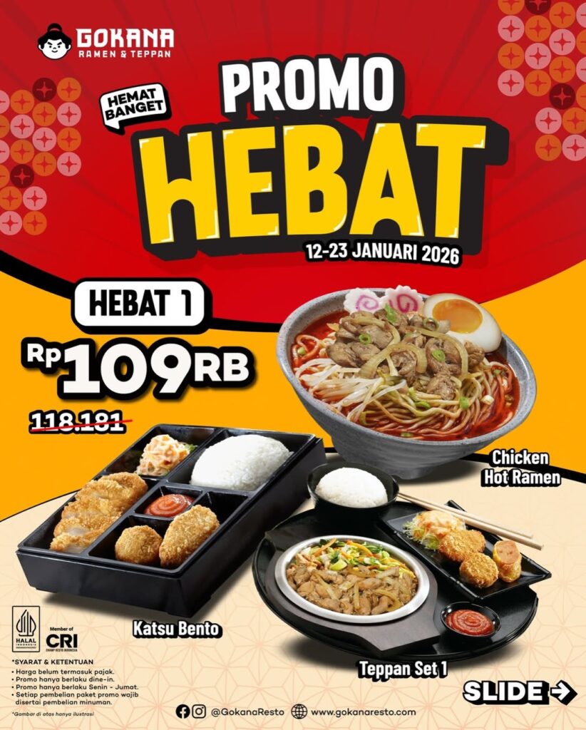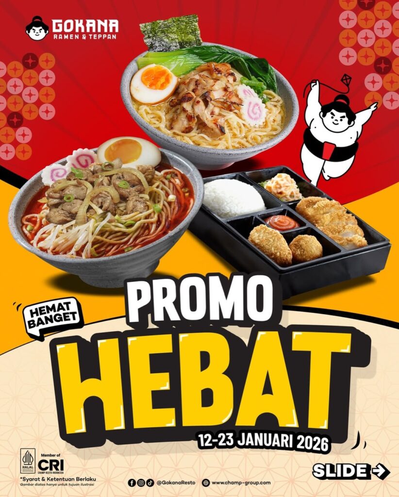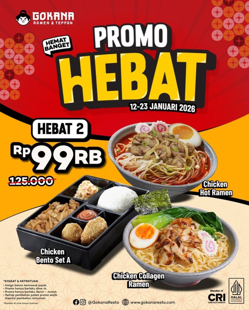 Kini, Gokana hadir sebagai solusi tepat untuk kamu. Nikmati Promo Hemat Banget dari Gokana mulai Rp99.000 di Bencoolen Mall Bengkulu. Sajian Teppan Set 1, Katsu Bento, hingga Chiken Hot Ramen dengan kuah hangat, irisan daging lembut, serta keju yang lumer di setiap gigitan siap memanjakan lidah dan menghangatkan suasana. Promo spesial ini berlaku hingga 23 Januari 2026 dan bisa kamu temukan di Bencoolen Hot Spot. Waktu yang tepat untuk menikmati hidangan Jepang favorit dengan rasa puas dan harga bersahabat.