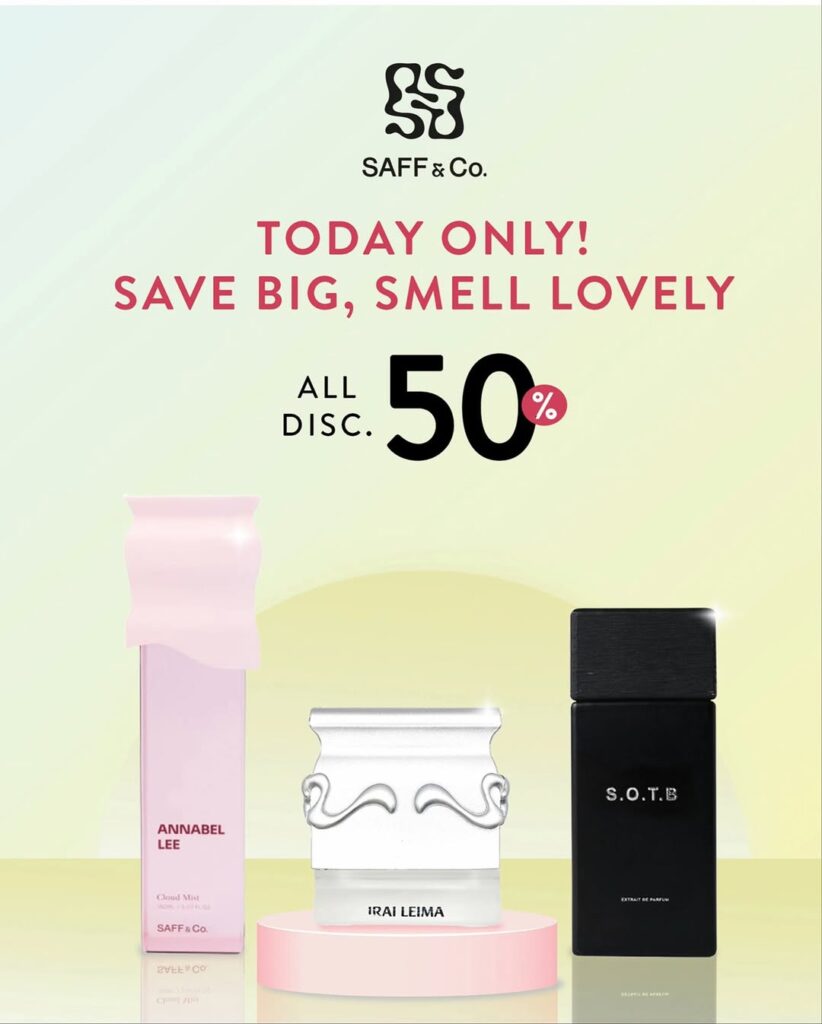 Spesial hari ini, semua item kecantikan mulai dari skincare, parfum, hingga kosmetik diskon 50%! Jadi, kamu bisa tampil wangi, glowing, dan percaya diri seharian tanpa bikin dompet tipis.