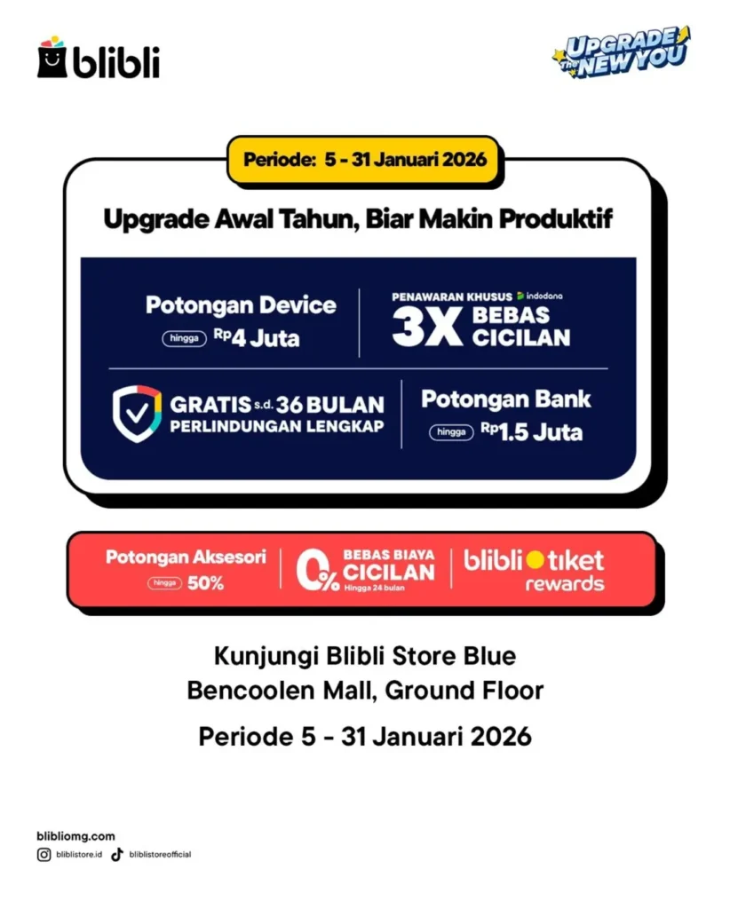 Kini saatnya beralih ke solusi yang lebih cerdas. Blibli Store di Bencoolen Mall Bengkulu menghadirkan beragam pilihan gadget terkini dengan performa unggulan dan desain modern. Mulai dari smartphone, laptop, hingga aksesoris penunjang, semua siap mendukung aktivitas harian agar lebih cepat, praktis, dan maksimal sepanjang tahun